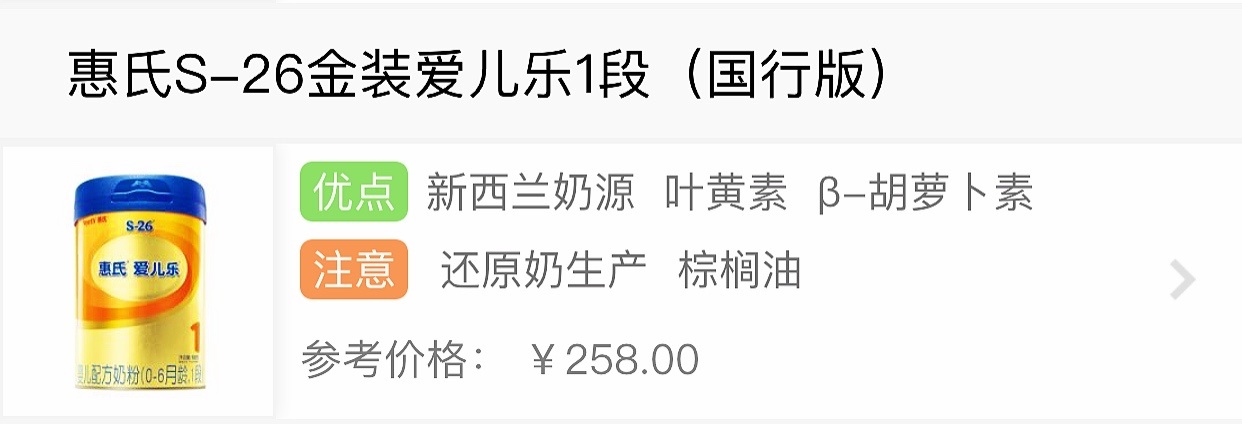 惠氏S-26金装1段采用新西兰奶源,使用大包粉兑水的还原奶来生产,还原奶比鲜奶多一重工序,因此在生产过程中流失的营养素比鲜奶更多,而且没有鲜奶那么新鲜。